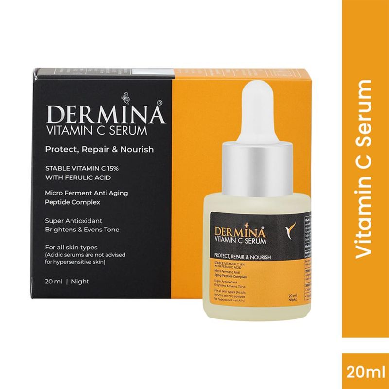 Dermina vitamin C serum, The concentrated goodness of Vitamin C 15%, Mushroom Extracts, Ferulic Acid, and Niacinamide have been formulated together to give your skin a boost of radiance, and brightness. The antioxidants in the serum work to stabilize the skin’s texture and restore its glow.